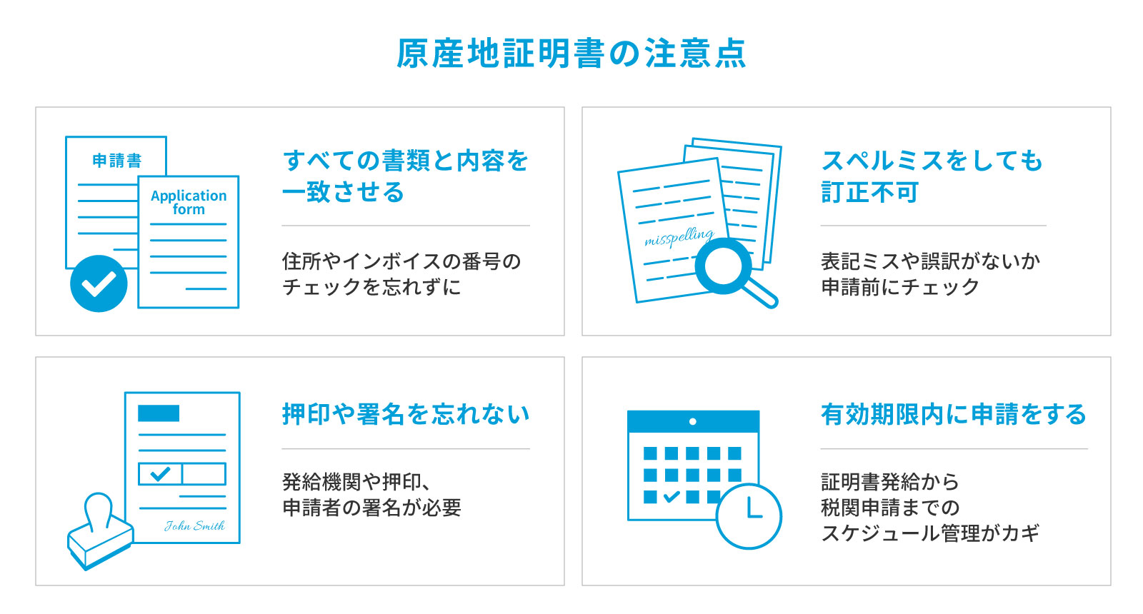 原産地証明書は、内容の不備や手続き上のミスがあると、発給が拒否されたり、通関時に無効にされたりするおそれがあります。下記のようなポイントに注意して、適切に対応しましょう。