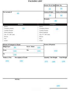 A. パッキングリストには、輸出者や輸入者、インボイス番号、輸送方法、支払条件といった「物流の情報」と、品名、数量、重量、梱包形態などの「貨物の情報」を記載します。企業によってフォーマットは異なりますが、記載項目はほぼ共通です。必要に応じて、通知先や容積などの補足情報を追加することもあります。