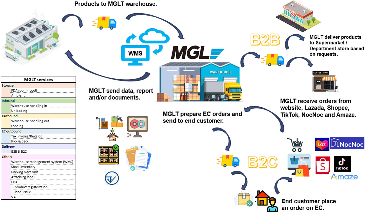MGL’s overseas offices act as import agents on behalf of customers and, under customer instructions, plan overseas sales and provide direct marketing services. We offer one-stop solutions necessary for e-commerce, including building websites for customer sales, utilizing EC platforms, operating logistics centers, delivery, payment management, customer support, and sales agency services.